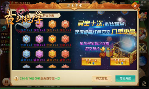 不是人人都能当摸金校尉,但是咱们都可以去寻宝!在冰河《古剑绝学》中,每名玩家都可免费参与符文寻宝活动,轻松抽取各品质符文与符文碎片奖励。玩家每次单抽,100%必得36-42个符文碎片,每次十连寻宝,更可100%获取橙色符文一个,而且获取极品红色符文的几率更高哦!