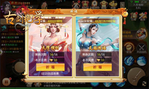 相信混迹冰河《古剑绝学》中的老玩家们看到这样的疑问都会呵呵一笑!只要玩家仔细观察,便可发现每日必不可错过的祈福玩法。游戏中,玩家每天均可免费祈福,享受至少40万铜钱与海量经验的奖励!如果玩家愿意豪掷一笔小钱,同样也可额外获取更多铜钱与经验,做到升级赚钱两不误哦!