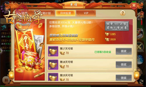 相信每个曾经一贫如洗的小伙伴,都想有一天能够“当上总经理出任CEO迎娶白富美”吧!在这之前,没有钱可是不行的哦!冰河《古剑绝学》中,只要玩家在任意时间参与月卡投资,投入300或更多元宝,即可分30天领取8倍收益,投资当天更可直接获取与本金想当的海量元宝哦!一天投资,三十天收益,各位玩家是否愿意以小赚大呢?