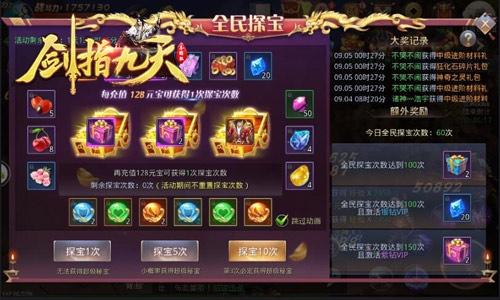 药药切克闹,我说福利你说要!不论各位玩家是否有freestyle,小编都将为大家送上各类全民福利哦!冰河游戏首款3D-ARPG正统武侠手游《剑指九天》(安卓版)全民探宝活动正式开启,全体玩家共享进度福利,更有多重狂欢惊喜疯狂送不停!话不多说,快跟着小编去游戏里看看吧!