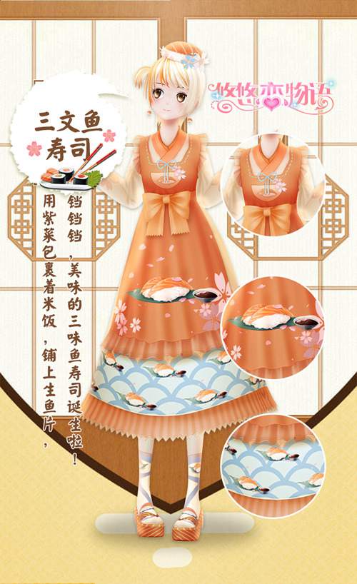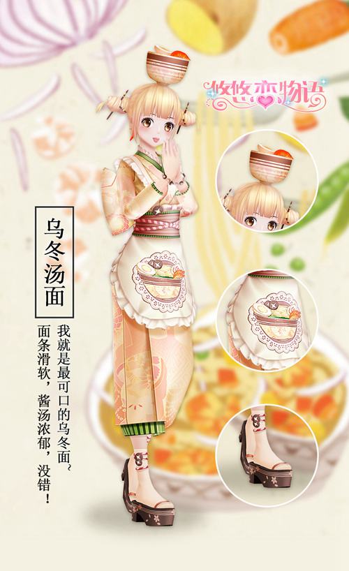 【三文鱼寿司】闪亮登场,用紫菜包裹着米饭,铺上生鱼片,美味的三文鱼寿司诞生啦!一身橘色的和风长裙,漫天樱花乱舞中,平静地品尝寿司的清爽口感。而一旁的【乌冬汤面】也按耐不住寂寞了,开始了自我介绍,“苗条滑软,酱汤浓郁,我就是最可口的乌冬面啦”和风装扮的悠悠酱,头顶满满一碗面条,奉上祝福和祈愿,和风美味送到你面前。