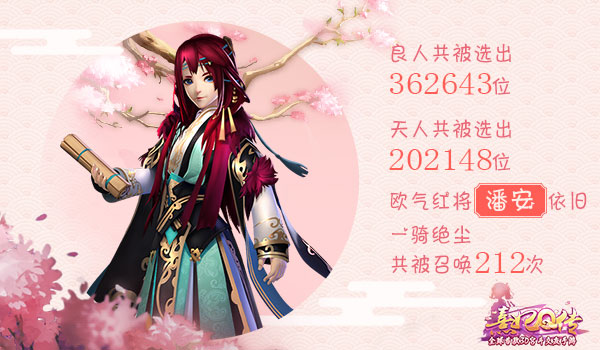 小主们对抽选良人和天人的热情简直让人叹为观止,短短14天中,良人共被选出362643位,天人共被选出202148位。而潘安作为首测的欧气红将,在二测的出现率依旧以212次一马当先!