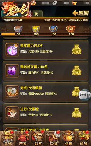 此外,《碧血剑》游戏中的游历冒险、夺宝和副本都有一定的几率产出精力丹。运银船、充值活动和限时活动也有精力丹产出。