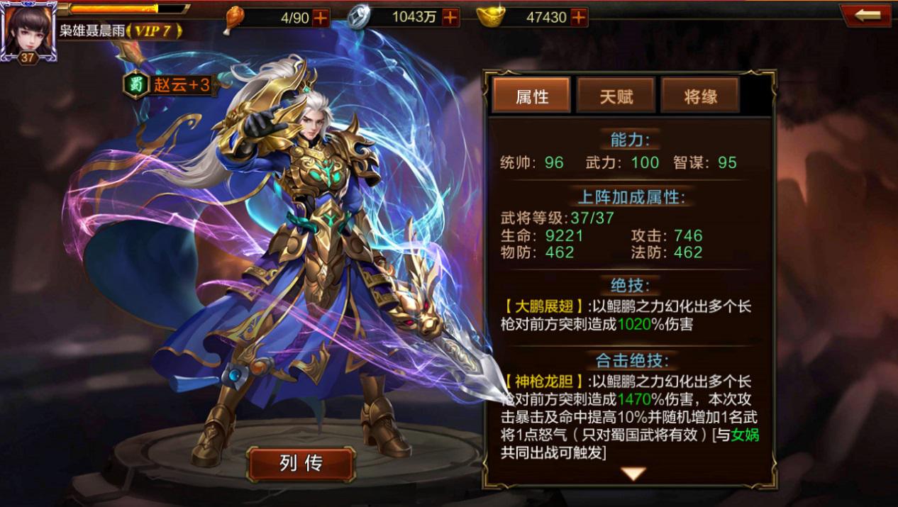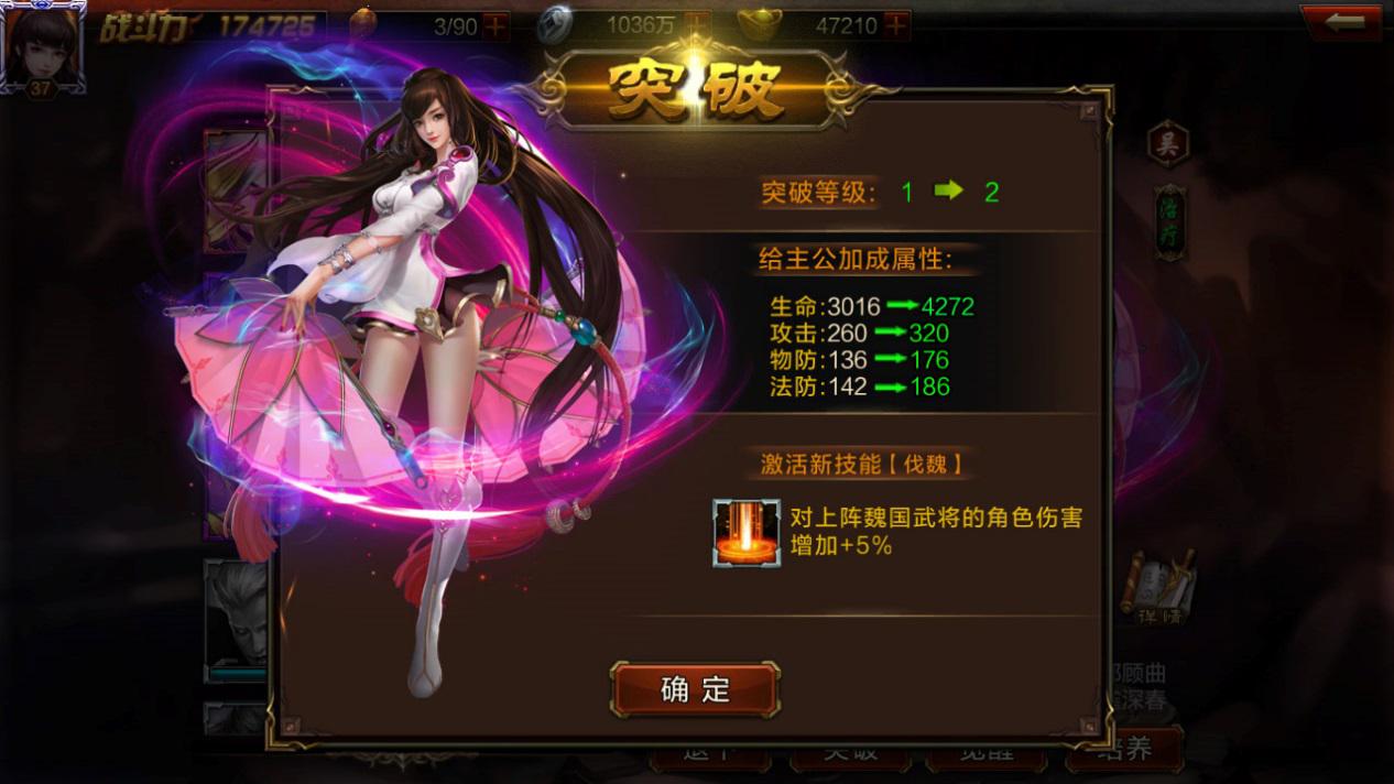 通过武将界面我们还可以了解具体的加成方向及效果,当武将突破时玩家角色的生命、攻击、法防、物防四大基础属性均可得到直接提升,而除了携带武将出战时的战力加成之外,对武将进行突破、觉醒等操作还可能激活更多技能威力不断强化的隐形战斗效果。