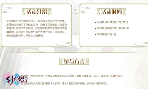 9月13日,《剑仆契约》官方推出“刀剑轶事”同人文征集活动,本次活动征稿时间为2017年9月13日——2017年10月22日,《剑仆契约》同人文作品征集体载不限,短篇故事、轻小说、连载等皆可。快来一起脑洞大开,动笔向众人展示你眼中的剑仆契约,更有现金及超值奖励!