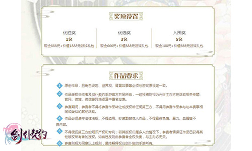 此次刀剑轶事《剑仆契约》同人文征集活动设有优胜奖1名,可获得现金888及价值1888元的《剑仆契约》游戏礼包;优选奖3名,可获得现金666及价值888元的《剑仆契约》游戏礼包;入围奖5名,可获得现金188及价值666元的《剑仆契约》游戏礼包。《剑仆契约》同人文征集要求作品有原创性,世界观、故事背景、故事人物等,不能得脱离官方设定。作品投稿则需要通过微博发文并@剑仆契约手游官方微博。