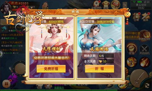 若想从前年古墓中全身而退,只掌握“人点烛,鬼吹灯,鸡鸣灯灭不摸金”等等口诀可不够!冰河《古剑绝学》中,玩家可在祈福玩法中为自己祈求“天降横财”、“天赐横幅”两大福运,每次仅需10元宝即可换取千万经验与40万铜钱!偷偷告诉各位,每隔8小时,系统还将免费赠送一次免费铜钱祈福机会哦!