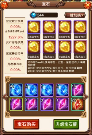 乐趣《不服小天王》中的宝石共有五色,每种色彩宝石对应不同辅助加成,绿色:宝宝攻击加成;黄色:金币银币掉率加成;蓝色:灵石掉落加成;紫色:宝宝暴击倍率加成;红色:勇者暴击率加成。可见,不同情况搭配不同宝石才能发挥它的最大功用。