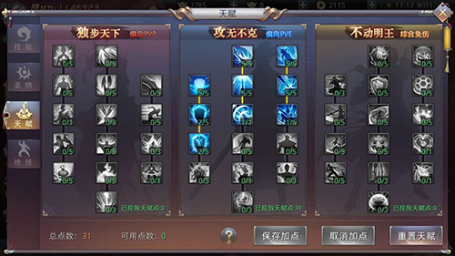 《昆仑墟》还贴心的推出天赋加点玩法,玩家每升一级的可获得天赋点,三大加点方向供道友们选择。独步天下加点偏向PVP,攻无不克加点偏向PVE,不动明王则是综合免伤。