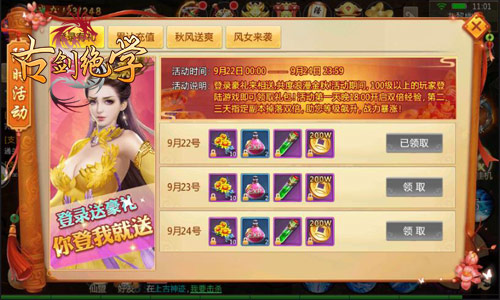 国庆中秋八天假马上就要来了,各位小哥哥小姐姐们准备好家里蹲了吗?在冰河《古剑绝学》中,无论是黄金假期,还是忙碌上班之时,各位玩家均可享受不定期开启的各类限时福利!例如近日的金秋九月限时活动期间,每日登录即可领取百万铜钱、疲劳药水等多重好礼,享受轻松修仙的乐趣哦!