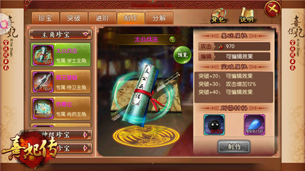 千呼万唤始出来,小主们期待已久的主角珍宝今日登陆宫廷!霸王楚戟、太公兵法、伤寒论以及塞上琵琶,四大主角职业专属的珍宝神兵降世。小主们用的珍宝自然与随从们的珍宝有所区别,不仅外观上更为酷炫,在属性效果方面也有所突破。小主可对主角珍宝的第二条基础属性、两条突破属性进行编辑修改,选择最适合小主使用的专属珍宝,如此在后宫战场上使用,才会更加得心应手。主角珍宝上线后,《熹妃传》官方将会根据游戏内实际情况进行适当的平衡性调整。