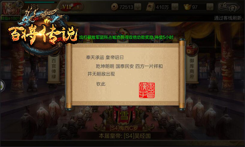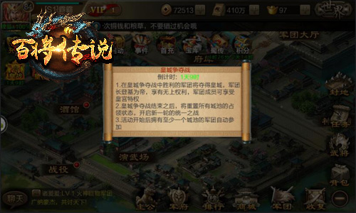 东汉末年分三国,始于黄巾贼子乱世称王;如今千百年已过,仍有不少玩家想在冰河《百将传说》中称王称霸!想当皇帝so easy,速来参与每周开启的皇城争夺战吧!皇城争夺战每周五准时开启,已经占领城池的军团将有资格参加皇位争夺战,只要军团能够守卫自己的城池,军团团长即可成为本周皇帝哦!