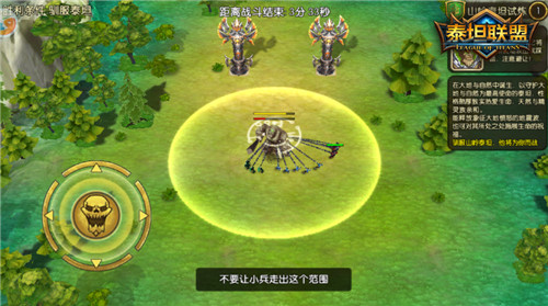 结束了酣畅淋漓的战斗后,我们就能基本上熟悉游戏的战斗方法。回到我们尚未发展起来的庇护所,是时候去唤醒沉睡的泰坦巨人了。接着便是游戏特色的巨人抓捕战,收服了巨人才能为我所用。指挥军团攻击巨人,当巨人血量降低到一定程度的时候,巨人会进入眩晕模式,头上会出现“抓捕”按钮,需要在眩晕期间立即点击抓捕按钮,随后巨人便会被五花大绑。这还没完,巨人会醒来挣扎,使用轮盘控制兵团才能慢慢将巨人制服。