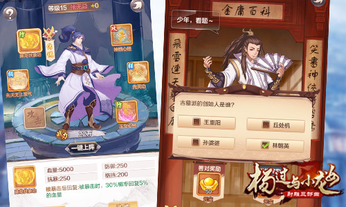 除了热血淋漓的厮杀对战,游戏更设置了“金庸考题”随时考验玩家,让资深金庸迷对答如流,优越感油然而生!除此之外,更有“拼酒拜师”“挖矿炼剑”等描绘英雄行走江湖的日常玩法,“据守襄阳”“勇闯冰火岛”等经典冒险也一并化作《杨过与小龙女》中的特色副本,层出不穷的游戏体验让一大波武侠迷直呼“欲罢不能”!