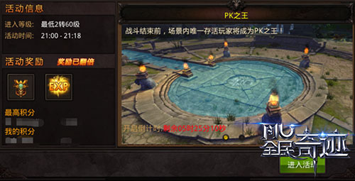 当玩家达到2转60级即可开启PK之王玩法,活动时间晚上21:00开始,持续18分钟。活动场景为强制PK地图,可以击杀任何人,不过死亡没有任何损失,杀人也不会有任何惩罚。活动时间内,在场上只剩下最后一名玩家,即为pK之王。
