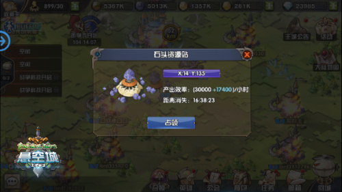 在《悬空城》的大地图,有很多野外资源站,但是每个资源站只有一种资源,同时需要一支部队就驻扎占领,等级越高的资源站单位时间产出的资源越多,只要你有足够强大且足够多的军队,你就可以占领越多的资源点,快速发展你的空中帝国。