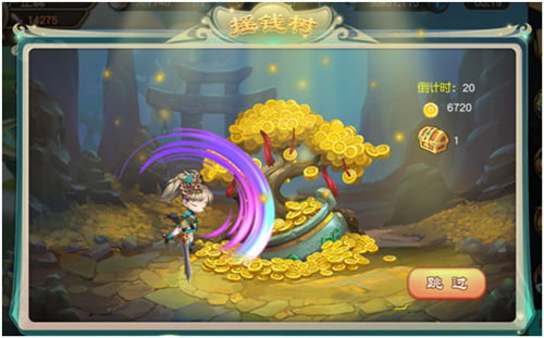 玩家在游戏内在线一定时间,有几率碰到摇钱树,玩家通过快速点击可以对摇钱树进行连击,连击越多获得的金币越多。这个时候就是大家拼手速的时候了!