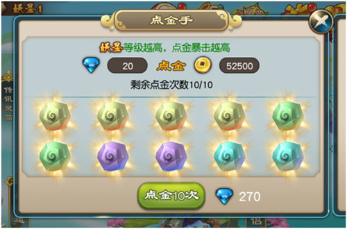 点金手功能可以消耗钻石购买大量金币,获得的金币有几率出现暴击,暴击几率随着妖圣等级的提高而增加。考虑到游戏中后期金币的紧缺,每天购买几次低价的点金手是长期可持续发展的良好习惯。当然了,土豪玩家请随意~~~