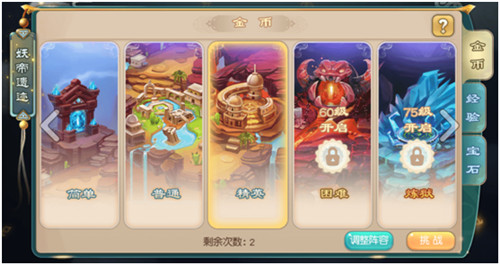 妖帝遗迹是游戏中产出金币最重要的途径,玩家每提升15级可以开启新难度,难度越高获得的金币数量越多。每天总共有2次的挑战机会,大家一定要努力的培养自己的队伍,这样在等级达到要求时能够通关对应难度的副本,获得大量的金币奖励。