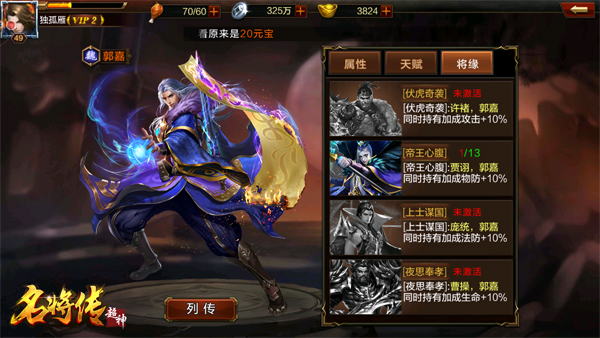 郭嘉是曹操手下著名的谋士,此人神机莫测,堪称鬼才!在《超神名将传》中,郭嘉是魏国的一位优秀治疗武将,他可以通过绝技“兵道鬼谋”,召唤鬼域兵符,对前方连续造成400%的伤害,同时还能治疗自身。此外,当郭嘉与司马懿同时出战时,可以施展绝技“逆天改命”,对前方连续造成1930%的伤害,威力绝对逆天!
