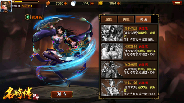 黄月英虽然是诸葛亮之妻,据说其本身的能耐比诸葛亮还强!在《超神名将传》中,黄月英是蜀国的治疗系武将,她的绝技为“十道天机”,可召唤天机令对周围造成400%的法术伤害,同时恢复自身的生命值。需要注意的是,当诸葛亮与黄月英同时出战时,就可以引发绝技“九劫真雷”,产生出1950%的法术伤害。