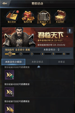 君临天下,开启后为期一周共6个活动。周一对应活动清理敌寇,在该活动阶段可以以击杀流寇、黄巾、土匪为任务,根据野怪等级的不同获得不同积分,当天根据最终积分领取个人阶段排名奖励;第二天周二,对应活动为内政建设,在此活动阶段内寻访武将寻获宝物,按照武将宝物的品阶计算积分,聚贤府跟潜龙阁寻访得到的武将都算积分,其他如随便换取的武将,不算积分;周三对应活动为资源采集,这是一个拉仇恨的活动,活动内容是按照主公们采集或者抢掠其他玩家的矿产数量计算积分。每1万铁矿起开始计分,不满1万不算积分。只计算采集跟掠夺的,不计算玩家沦陷其他玩家主城获取的资源;周四,第四阶段众志成城,需要玩家们连同盟友击杀南蛮,按照南蛮等级和对应等级的杀敌排名获得积分,参与此活动的个人积分将会在邮件中显示;周五,厉兵秣马,这个活动期间根据招募士兵和医疗士兵的数量来计算积分,次活动只计算士兵的数量,不计等级,可从兵营,募兵所及医舍三个渠道获得积分。此阶段也是为了周末大型的搞事活动做准备,到了周末,最后一个阶段,便是战争为王,此时将开启杀敌活动,按照击杀士兵的等级数量计分。