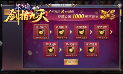 浸淫多年的小编,只想问各位玩家老铁一句话,你听说过七日投资吗?冰河《剑指九天》七日投资1000元宝,即可享受最高8倍返利,投资立领1000绑元,堪称各位江湖大佬不可错过的完美赚钱计划!各位想要发财的大R小R们,千万别错过每个角色仅限一次的七日投资八倍返利哦!