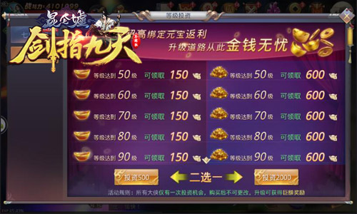初出茅庐,谁人不是一把剑一条狗?只是在升级过程当中,有人变成了一掷千金的土豪,有人成为了锱铢必较的穷光蛋……在冰河《剑指九天》中,若想轻松畅快升级,别忘记参与新人专属等级投资哦!两种投资规格,返还海量铜钱、绑元,让玩家升级过程中再也不因缺元宝而困扰!