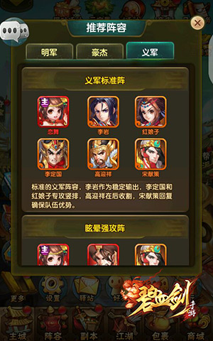 《碧血剑》手游中分为明军、豪杰和义军三大阵营,每个阵营又有数十位不同的英雄的,不同英雄搭配可以组成不同类型的阵容。如攻防平衡的标准阵容、争夺战场先机的昏眩强攻阵容、保存自身实力的减伤强攻阵容和双红将出战的回怒高攻阵容等各具特色的阵容。不过因为游戏在阵容培养方面的高度自由,即使是同样的英雄阵容,不同玩家发挥出的实力也是高低分明。建议刚接触游戏的玩家,可以先按照游戏推荐的阵容进行培养!