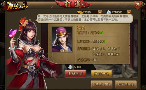 在打造系统中,主公们首先要寻访打造师,第一次寻访打造师时无需花费银两,之后每次寻访都需要花费更多的银两。打造成功一件武器之后,寻访次数重置,主公将会再次获得免费的寻访机会。打造师大概可以分为三类,第一类能够打造+1橙武,第二类能够打造+4橙武,第三类能够打造专属武器,这三类武器的打造成功率分别为:100%、50%、20%,专属武器成功概率最低,且消耗最多,各位主公如何选择全看自身需求。