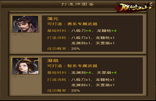 当主公们选定了打造师之后,需要准备两种材料,一为失败后不会消耗的基础材料,二为消耗材料,准备完毕即可开始打造。蒲元和凝扇两位打造师分别可以打造勇系和智系专属武器,刷到这两位大师级的师傅千万不要错过。打造专属武器并不能指定具体某一件,因此寻访和打造都有不少的运气成分,切莫贪“打”哦。而蒲元和凝扇两位大师怕是要成为众矢之的了。