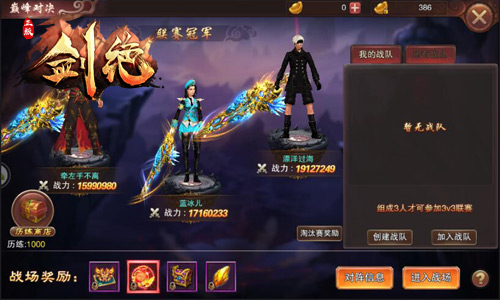 无PK,不武侠!要做最强武侠王者,别错过全新3v3巅峰对决。在冰河《剑绝》中,3v3巅峰对决每周准时开启,玩家可自由组建3人战队报名参战。经过初选过后,16支玩家战队将进行逐轮对决,最终决出冠亚季军,并瓜分“无敌于世”、“威震群豪”、“笑傲群豪”等三大称号与海量历练、元宝、传说装备秘卷等海量道具奖励哦!
