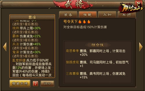 曹老板自该披挂上阵,曹操有增加兵力上限和伤害减免的天赋,也有两个攻击天赋,定位是半肉法坦。觉醒技能需要掉兵力才能触发,所以放在前排比较合理。触发觉醒能够对敌人前排造成伤害,并且提升友军40%的伤害,持续5个回合。同时搭配游戏中曹操的最佳搭档司马懿,两人同时上阵增加初始怒气,司马作前排其觉醒技能可以虚弱对面武将,并让自己获得减伤效果,可以和曹操一起当肉盾。