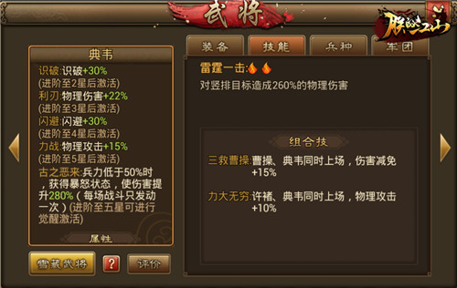 最后当然是输出位置了,许褚得益于“虎痴之力”的补刀能力以及增伤效果,经过削弱之后依然是输出位的佼佼者,觉醒技发动5次之后伤害爆炸。而好兄弟典韦则是超高爆发的点杀输出,基础伤害260%的物理伤害大招,配合“古之恶来”280%伤害的提升,能够对敌方竖排单位造成毁灭性打击。