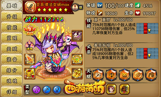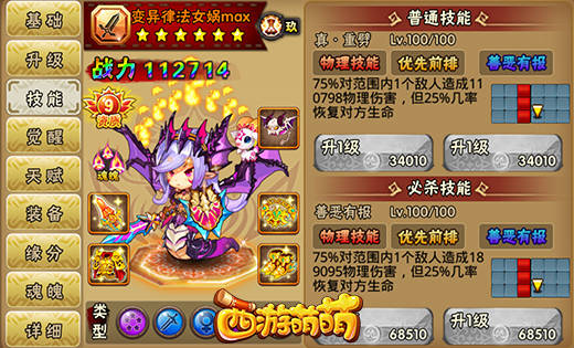 变异律法女娲为什么被成为《西游萌萌》中的BOSS杀手?主要就是因为她的单体爆发伤害实在是太高了。虽然有着概率性攻击失败的缺点,但是一旦成功打出伤害,少则技能轻松破10万,多则必杀伤害近20万。这种伤害值即使是BOSS的血量通常也只能是被瞬间秒杀了。