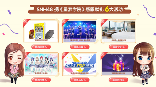 此次SNH48携手《星梦学院》开启了六大献礼活动,超豪华奖励阵容令人目不暇接。礼物不仅包含游戏内的虚拟偶像及钻石、金币等礼包的赠送,还为粉丝们准备了小偶像亲自挑选的神秘礼物、海量周边、免费的《星梦学院》特别公演门票。官方还将额外为中奖的外地粉丝报销机票及酒店费用,以便外地获奖粉丝能顺利观看公演,专人接待可谓贴心又豪气!