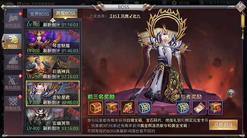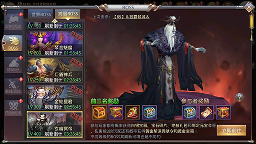 在现在的跨服战场之中有三大BOSS最是难打,250级皮糙肉厚的巨盾神兵、300级攻击力爆表的金轮星君与400级的终极BOSS玄幽冥帝。同样,奖励也丰富的让人口水直流,有各个职业的极品装备,三阶白银宝箱,高级绝技礼包等等,参与者也可以获得大量绑定元宝,与绝技奖励!