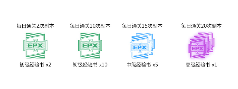 每日通关副本次数越多,奖励经验书就越多。此次奖励的经验书共分为初级经验卡、普通经验卡和高级经验卡三种。经验书可以加速你的等级提升,解锁更多天赋点和武器装备。