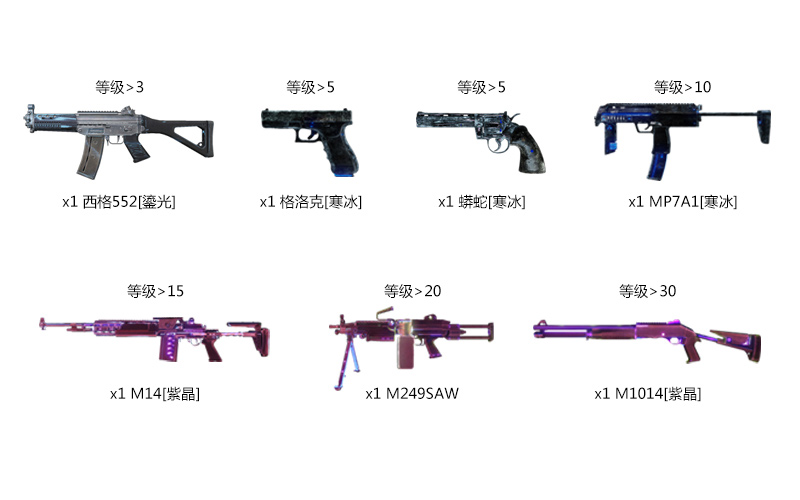 想要体验精美的稀有枪械,那就别错过这个活动,有钱也买不到。一把好枪是你成长必不可少的助力,活动期间,在0到30级之间,达到不同等级就可以解锁西格552[鎏光]、格洛克[寒冰]、蟒蛇[寒冰]、MP7A1[寒冰]、M14[紫晶]、M249SAW[紫晶]、M1014[紫晶]等精美枪械,所有枪械永久免费。