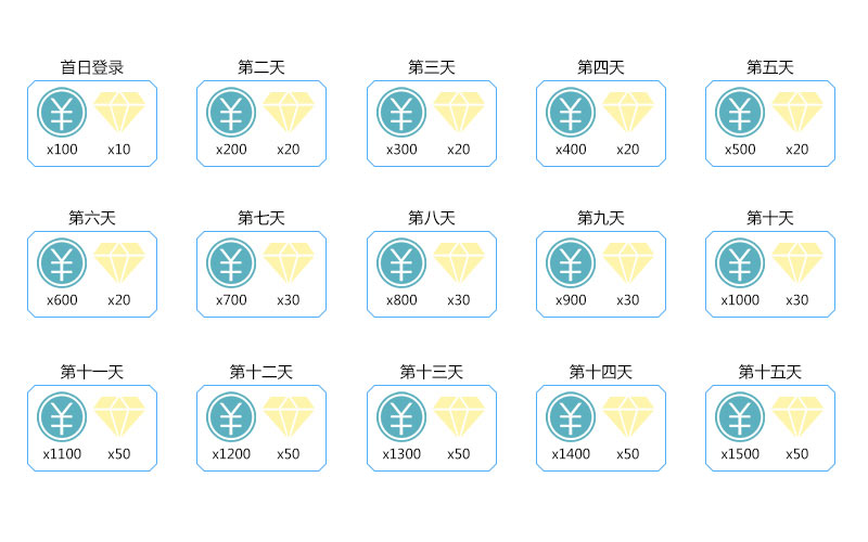 初来乍到,要打天下首先需要第一桶金。每天登录游戏既可领取金币和钻石。首日登录奖励 金币*100,钻石*10,连续登录奖励更加丰厚。商城武器每天只会免费更新一次,但玩家想拥有更多装备选择,钻石是刷新商城武器的唯一消耗品,如果你不想充值,每天登录游戏同样可以领取到钻石。