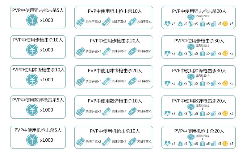 全系枪王日常练习目的为了激励玩家使用不同的枪械应战,以熟悉各种枪械属性和操作,为玩家打造全能枪王。在PVP使用狙击枪、步枪、冲锋枪、散弹枪、机枪完成规定的击杀人数,就可获得金币、各种手雷和道具礼包奖励。道具礼包包括:血量道具、攻击道具、速度道具、备弹道具、收益道具、 复活币。商城的军火、补给都是限量随机开放,任务就成为部分玩家的丰收场,稀有末日手雷,增益道具,复活币都会在任务中产出。