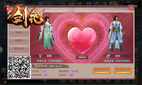 “开局一剑一条狗”听起来就很凄凉,难道玩个游戏还得忍受单身的痛苦吗?要想不做单身狗,不如来尝试冰河游戏首款ARPG玄幻武侠手游《剑绝》(安卓版)全新姻缘系统,结婚即送婚戒、爱情花,玩家还可互赠爱情宝匣每日领取海量元宝,更有爱情试炼考验玩家间默契度,让玩家感受姻缘玩法的别样乐趣!话不多说,快跟着小编去游戏里看看吧!
