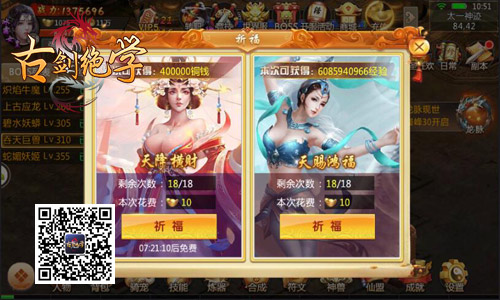 大R小R能氪金享福利,普通平民玩家难道就没有免费福利吗?当然有,冰河《古剑绝学》祈福玩法便是各位玩家赚取海量铜钱、经验的绝佳途径!每8小时1次免费祈福机会,让玩家可以轻松赚取海量铜钱或经验,每次祈福还有几率触发多重暴击,赢得2倍、4倍最高8倍资源奖赏,一分钱不花也可赚得体满钵满!