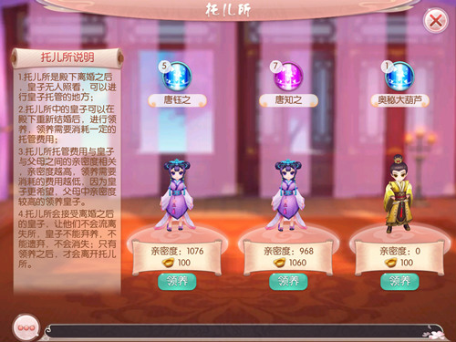 后宫之中风云变幻莫测,若因种种原因最终离婚皇后,皇子将会被送到托儿所进行寄样。托儿所中的皇子们可以在玩家重新结婚后,进行领养。皇子与玩家的亲密度越高,管理费用越低,并且夫妻之间亲密度较高的那个会被优先选为领养者。无论现实还是游戏,孩子都希望能跟亲人在一起,因此《胭脂妃》特意设定了皇子玩法,皇子不能被弃养、遗弃,只有领养之后才会离开托儿所。