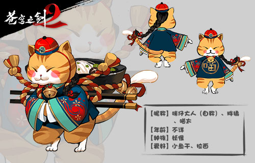咪仔大人通体橘黄,颈上系着封印妖力的铃铛,嘴里时常念叨着“吃鱼吃鱼!” 的口头禅。因为自己是上古妖怪出身,心里一直放不下架子,常用傲娇满满的语气怒怼他人,不过手里有小鱼干的人都是它的朋友。为了表现自己的与众不同,咪仔大人身着晚清大长褂,头戴红色瓜皮小帽,与红扑扑的脸蛋相映成趣;不仅如此,咪仔还身背拉面站立行走,两条小短腿吭哧吭哧走路带风。