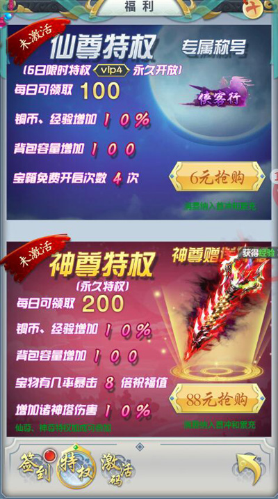 这次推出的月卡福利真的诚意满满,不仅有铜币、经验的增加,还有宝箱的免费开启;另外,那个宝物的暴击率也太好了吧!话不多说,特权开起来~~~