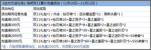 活动内容:活动期间,充值任意金额,并在贴吧双11充值活动专门贴下回复踩楼,即可领取充值礼包一份。达到不同额度要求,还可以额外再获得豪华奖励1份!活动详情请关注贴吧相关活动贴。