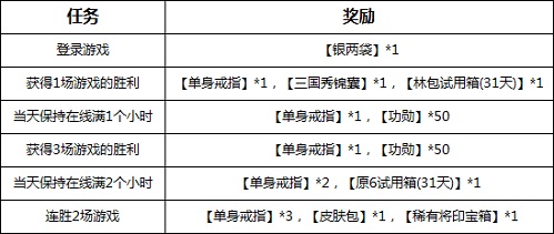 消费满5000元宝,可获得【单身戒指】*2,【普通将印宝箱】*2,限完成1次