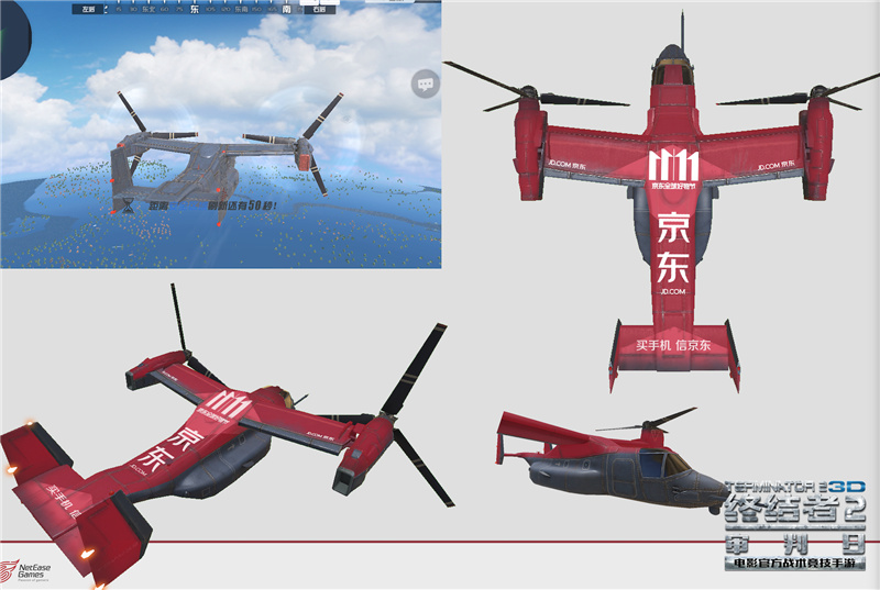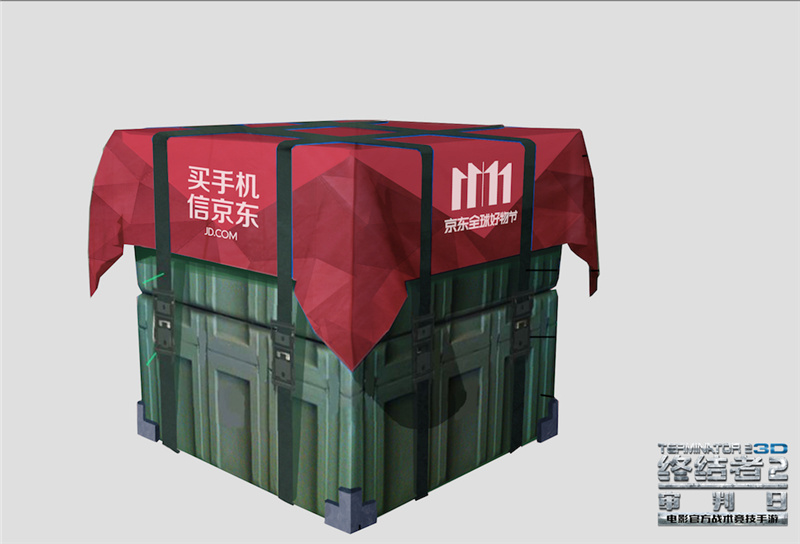 11月8日-13日,所有进入《终结者2:审判日》虚拟战场的玩家,都将置身于一架喷有京东广告的三螺旋桨飞机上,玩家在迅速查看地图和地形,判定降落地点和降落后行动路线的同时,也被喜庆的京东红和“11.11”、“买手机 信京东”的标语冲击视线,在此提醒各位终结者们,可千万不要光顾着看京东的广告,而耽误了跳伞的良机!