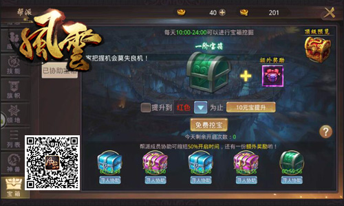 一个人的江湖,只有空虚寂寞;一群人的江湖,才能有热血与疯狂!在冰河《风云志》中,玩家加入任意帮派后即可享受每日5次开启帮派宝箱的机会,每次开箱均可获得海量魂石。如果玩家与帮派其他小伙伴互相协助开箱,不仅可大幅降低开箱时间,更可额外获得一份魂石奖励哦!